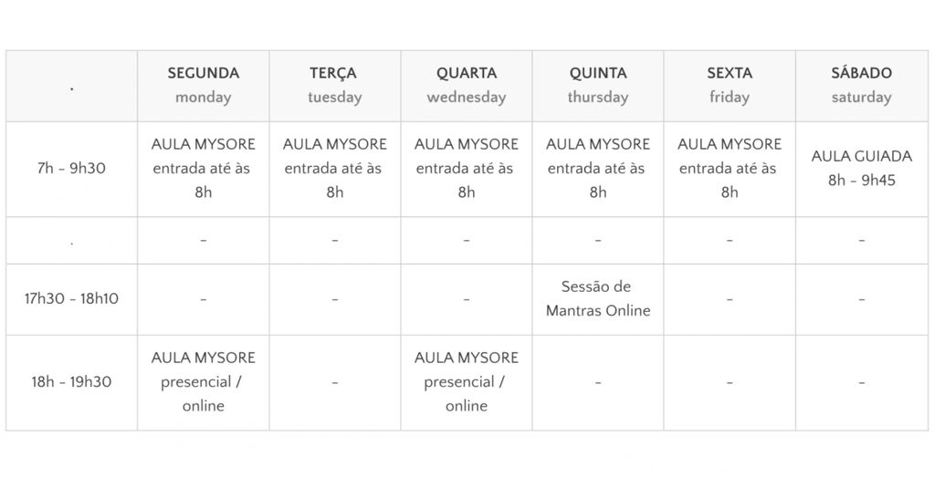 Observamos dia de descanso nos dias de Lua Cheia e de Lua Nova. Sendo que não há aulas, Estilo Mysore e/ou Aula Guiada. Alunos serão avisados atempadamente.As datas dos dias de descanso nos próximos meses: